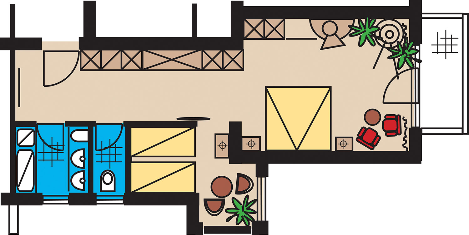 Die großzügige Suite beinhaltet zwei getrennte Zimmern, Balkon, großes Badezimmer mit Doppelwaschbecken, Badewanne, WC, Dusche, Bidet, Fön, Telefon, Safe, Stereo-Anlage, Flat-TV, Sat-TV, Video, Radio, Minibar, Wi-Fi.